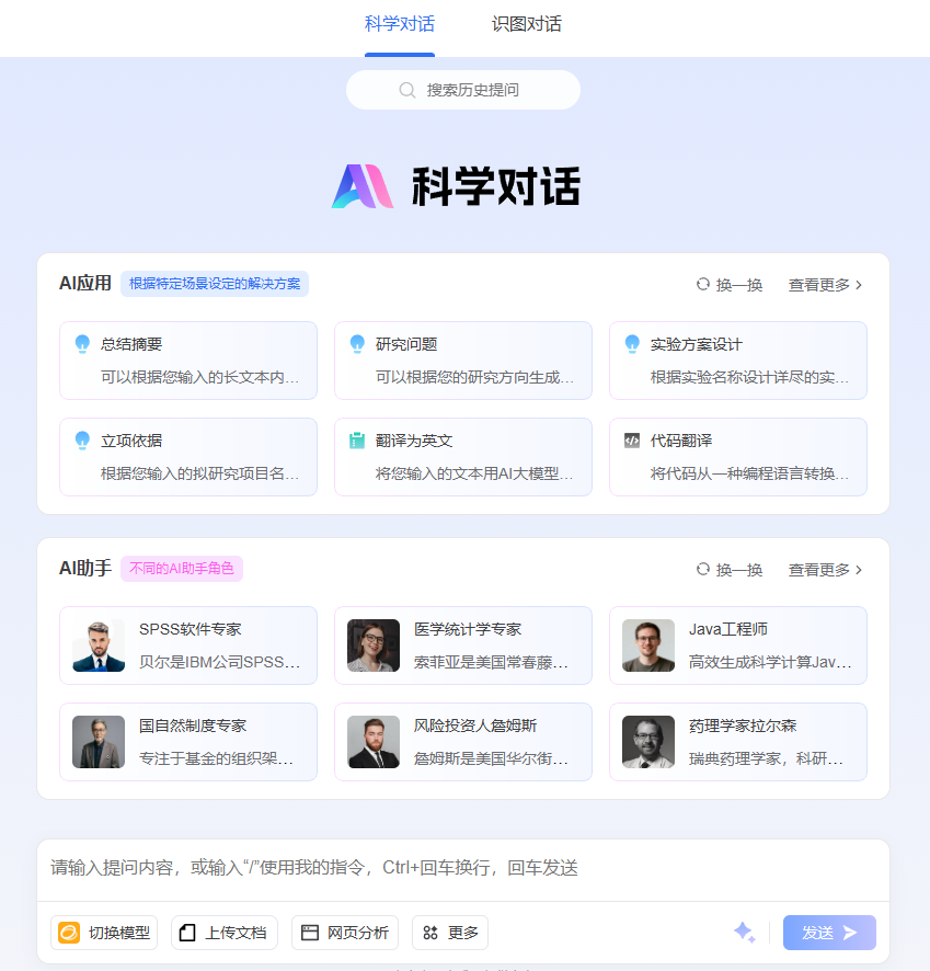 - 科学对话 / 识图对话:支持文本、图像多模态智能问答,帮助科研人员快速解决问题、分析数据、解读文献。