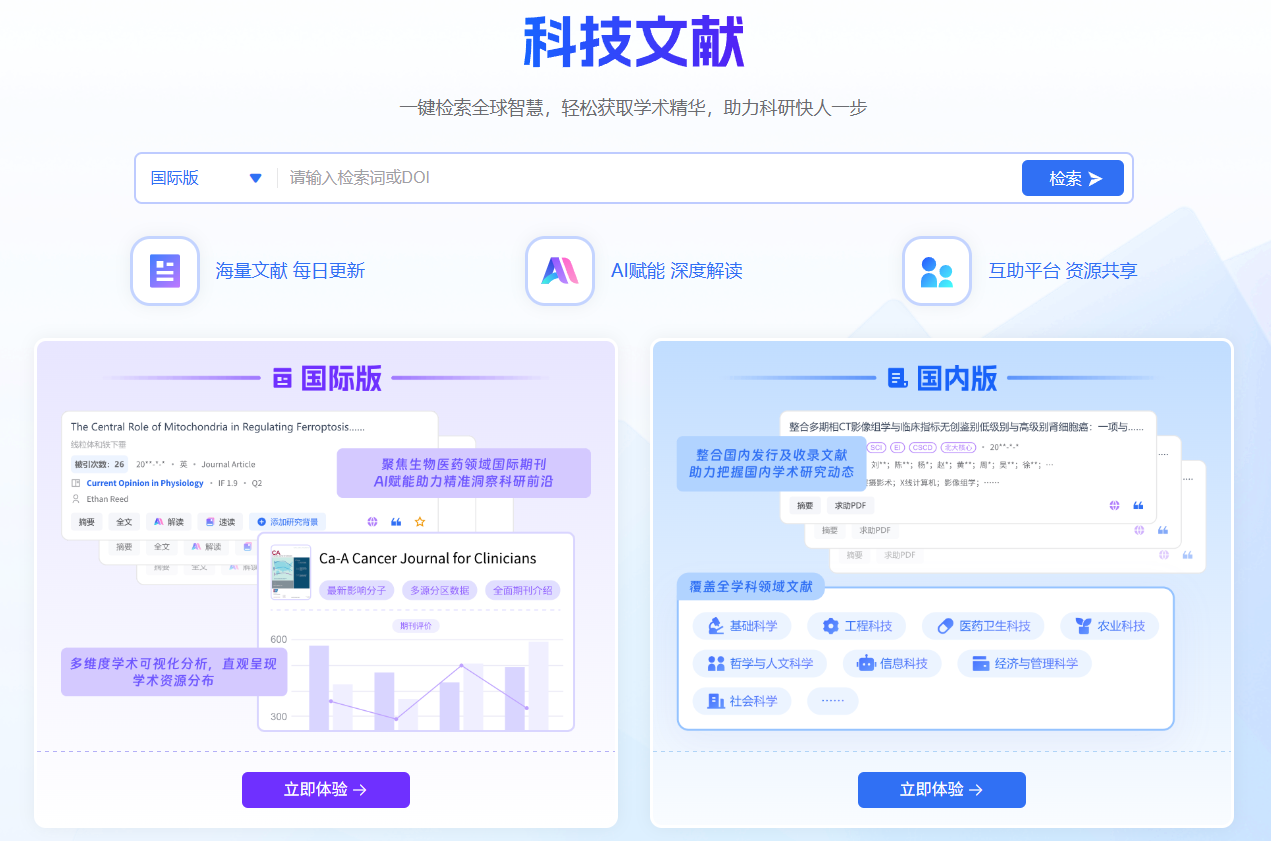- 科技文献:整合近4000万国际英文文献与国内核心期刊资源,支持AI文献解读、智能选刊等功能,让科研人员在最短时间内把握全球研究动态。