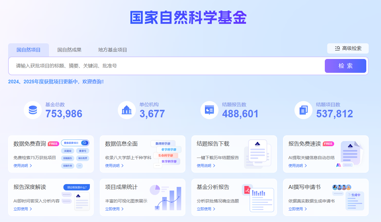 - 自然基金数据库:提供权威科研项目与成果数据的可视化分析,辅助科研人员发现热点领域、优化研究方向、提高课题命中率。