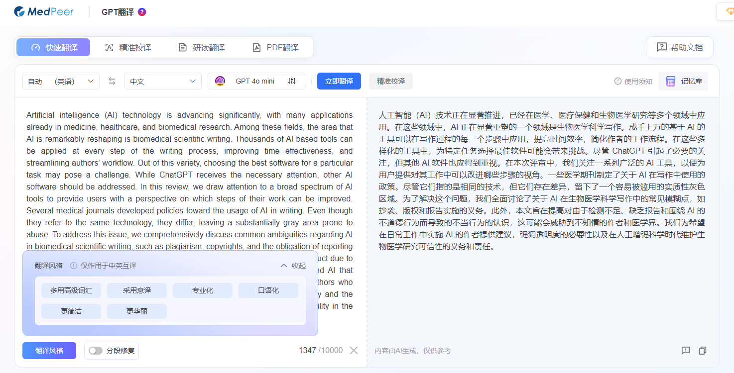 - 机器翻译 / GPT翻译:多语言高精度翻译,内置200+学科专业术语库,支持长文本、表格、PDF等全格式处理,确保科研交流无障碍。
