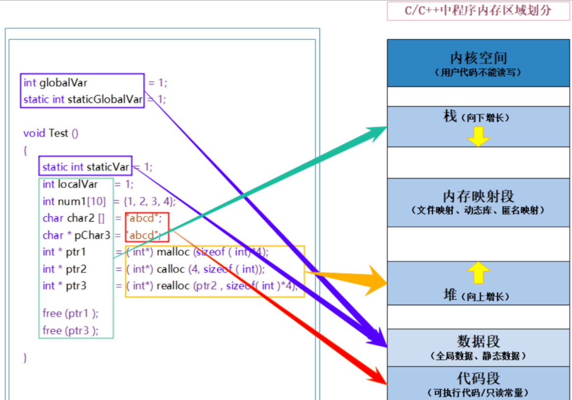 - 栈:又叫堆栈--非静态局部变量/函数参数/返回值等等,栈是向下增长的。