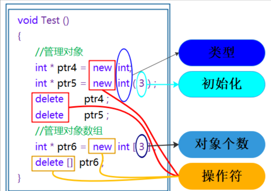 - 3. malloc申请空间时,需要手动计算空间大小并传递,new只需在其后跟上空间的类型即可,如果是多个对象,[ ]中指定对象个数即可