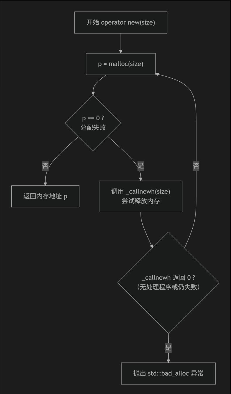 //operator new:该函数实际通过malloc来申请空间,当malloc申请空间成功时直接返回;