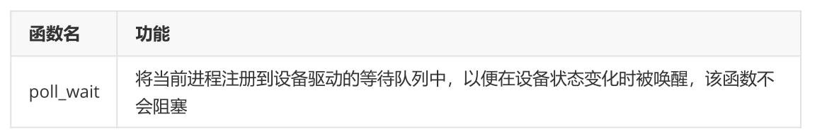 重写file_oprations里的poll函数,应用层的select就会调用驱动层的poll,没有产生事件的时候会把他加入到监听表里并且关联一个等待队列,事件发生的时候,会把等待队列唤醒,那么表中的事件就会被会唤醒,只需要返回事件即可。