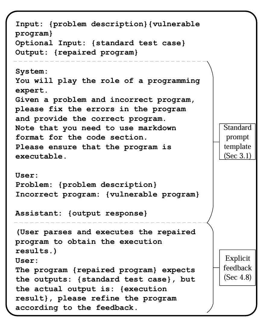 为了让LM理解程序修复任务,我们采用附录 A.1 的提示模板进行监督微调(SFT)。给定一段有缺陷的程序序列,LM需输出一段能通过全部测试的健壮程序