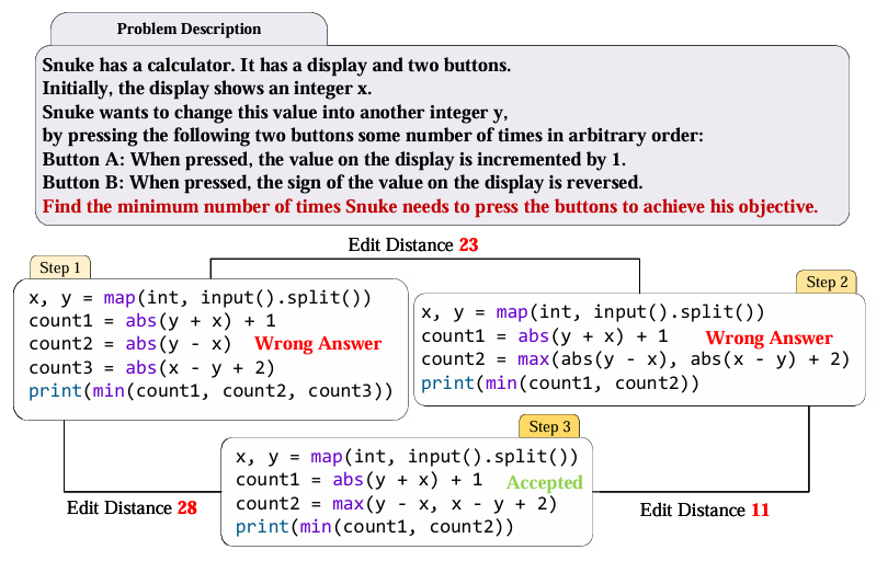 图1展示了编程竞赛中选手改进代码的典型流程:该流程由编译器和测试用例引导:参赛者首先根据题意和约束条件构建程序的初步版本,然后通过不断提交、获取反馈、进行交互来完成修复。