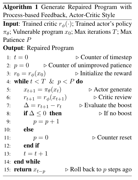 Algorithm 1:生成基于过程反馈的修复程序,采用演员-评论家模式
