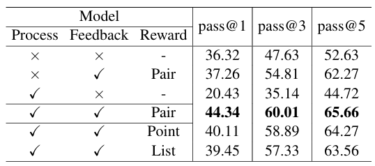 Table 4: 消融实验的结果。我们对过程监督、反馈和奖励函数的设计进行了深入研究。实验结果验证了我们模型的有效性。Point: Point-wise loss;Pair: Pair-wise loss;List: List-wise loss。