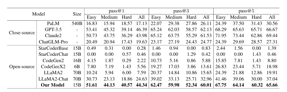 我们依据 140 亿条提交记录中的通过率来衡量问题难度,将问题分为简单(easy)、中等(medium)、困难(hard)三类。表 3 给出各模型在不同难度上的 pass@k 。我们的模型在所有开源模型中表现最优;即便与商业闭源大模型(如 GPT3.5、Claude2)相比,也具备竞争力;与同等规模的 StarCoder/CodeGen2 系列相比显著领先。此外,LLaMA2-Chat 的实验显示,多轮对话式监督微调并未削弱、反而增强了其对人类指令的理解与修复能力。