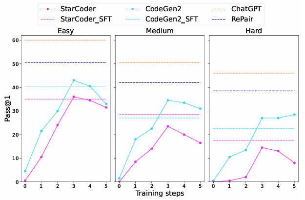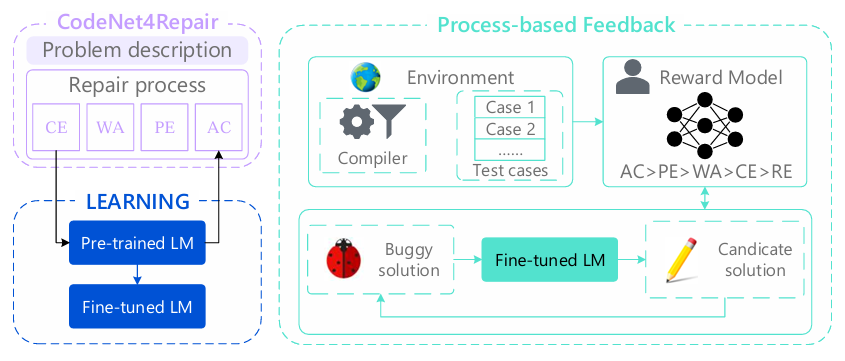 在本文中,我们探讨了小规模LM(小于20B参数)如何通过过程监督与反馈实现优异的性能。我们首先构建一个名为CodeNet4Repair的数据集,其中包含多个修复记录,用于监督基础模型的微调。在此基础上,我们借鉴强化学习的思想,我们进一步训练了一个奖励模型(Reward Model),作为评判器,为微调后的LM提供反馈,逐步优化其修复策略。在推理过程中,我们要求LM迭代生成解决方案,直到修复效果不再提升或达到最大步长限制。