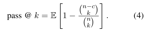 以往程序修复数据集缺乏标注测试用例和稳定的执行环境,导致无法依据程序执行结果自动评估模型性能。我们主张采用基于执行结果的评估方式。参照前人代码生成任务的评估方法,我们使用 pass@k 作为指标(Hendrycks et al., 2021; Chen et al., 2021),其中: