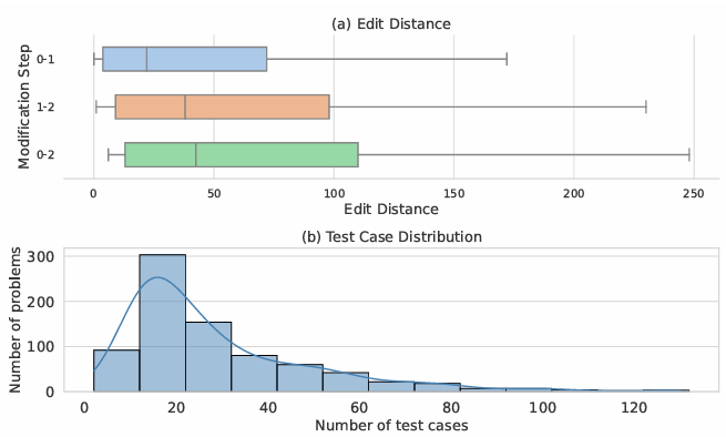 我们从CodeNet4Repair中抽取那些经过两步修改后修复成功的记录,得到三个版本,并计算这些版本之间的编辑距离。如图 3(a) 所示,结果与我们的假设一致:一次性修复所需的编辑距离远大于多步修复所需的编辑距离。尽管多步修复在总体代价上有所增加,但逐步修复能显著降低任务复杂度。
