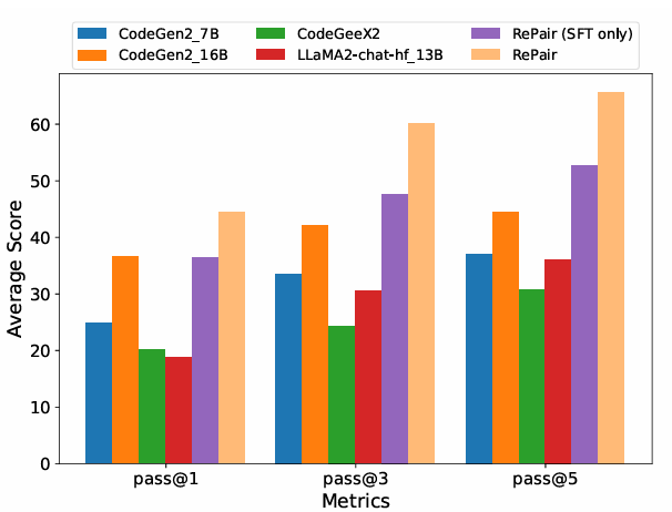 有些人可能会质疑RePair相对于当前开源模型的优越性,因为我们在训练集上使用了监督微调(SFT)。澄清 SFT 是用来增强模型对修复任务的理解,而不是性能改进的主要因素,这一点很重要。为验证性能提升是否仅来自 SFT ,我们在相同数据集上微调了多种开源模型(如 CodeGen2、LLaMA2-Chat),结果如图 4 所示。虽然 SFT 提高了模型的性能,然而这种改进很大程度上是由于模型对任务的理解增加和输出格式的标准化。此外,当与 SFT 相结合时,基于过程的反馈方法显著放大了模型的潜力,获得了更大的性能提升。