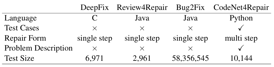 Table 1: CodeNet4Repair 数据集与现有程序修复数据集的比较。