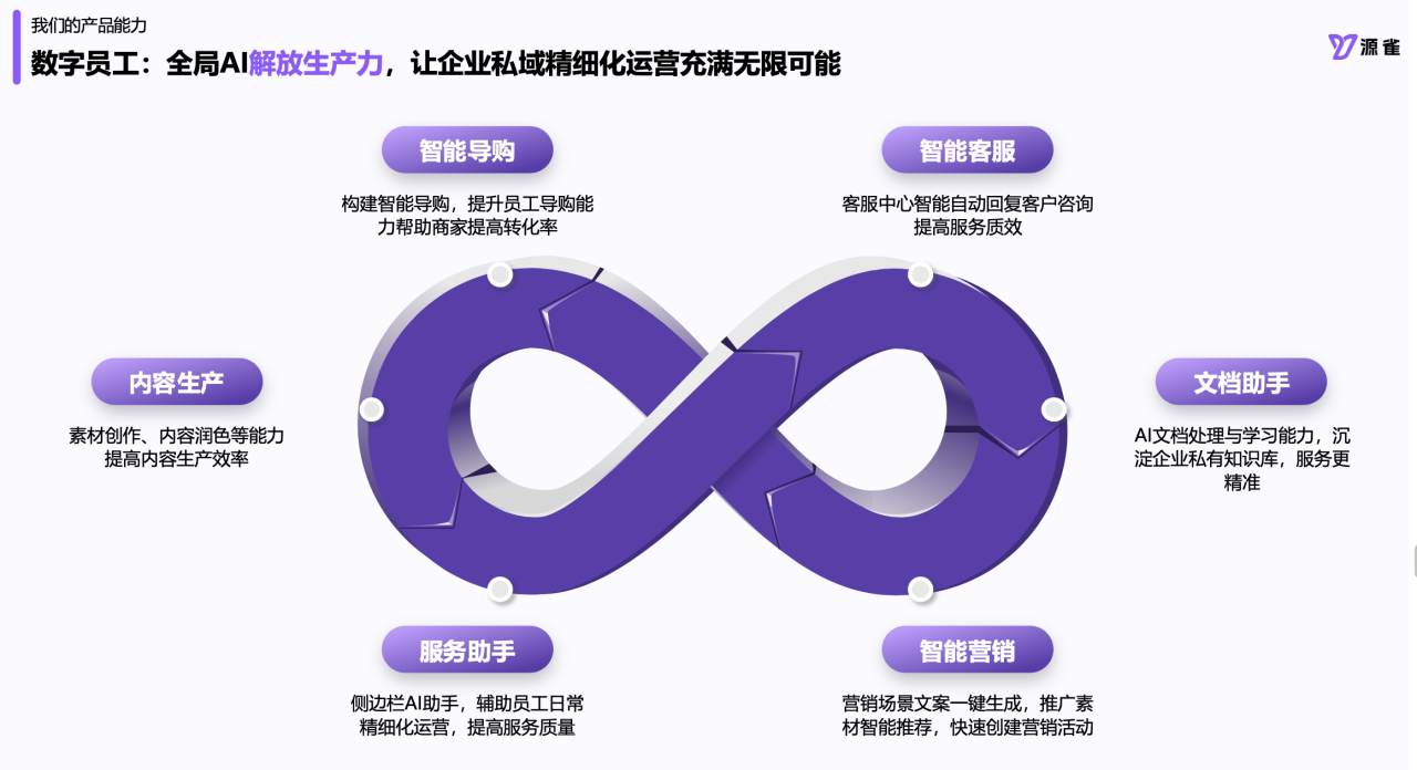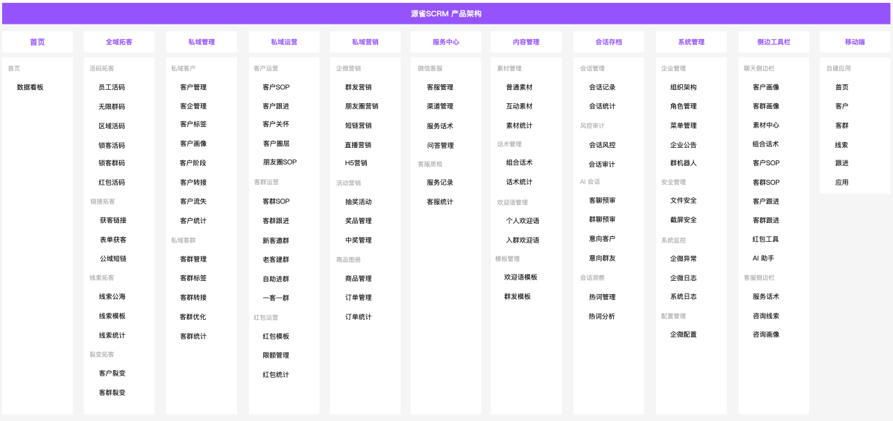 源雀数智是致力于源码交付的私域数智化营销解决方案提供商,从源头助力企业私域建设更自由、更安全,其中源雀SCRM是源码100%交付的私域数智化营销解决方案,从架构层到应用层再到服务层,全面解决企业私域数据安全及业务定制化问题,实现SCRM “开箱即用、自由定制、私有部署、持续服务”的建设目标。在最新开源版本中,除了企业微信SCRM基础的获客引流、客户管理等基础模块以外,还集成智能应答、人工协作的客服