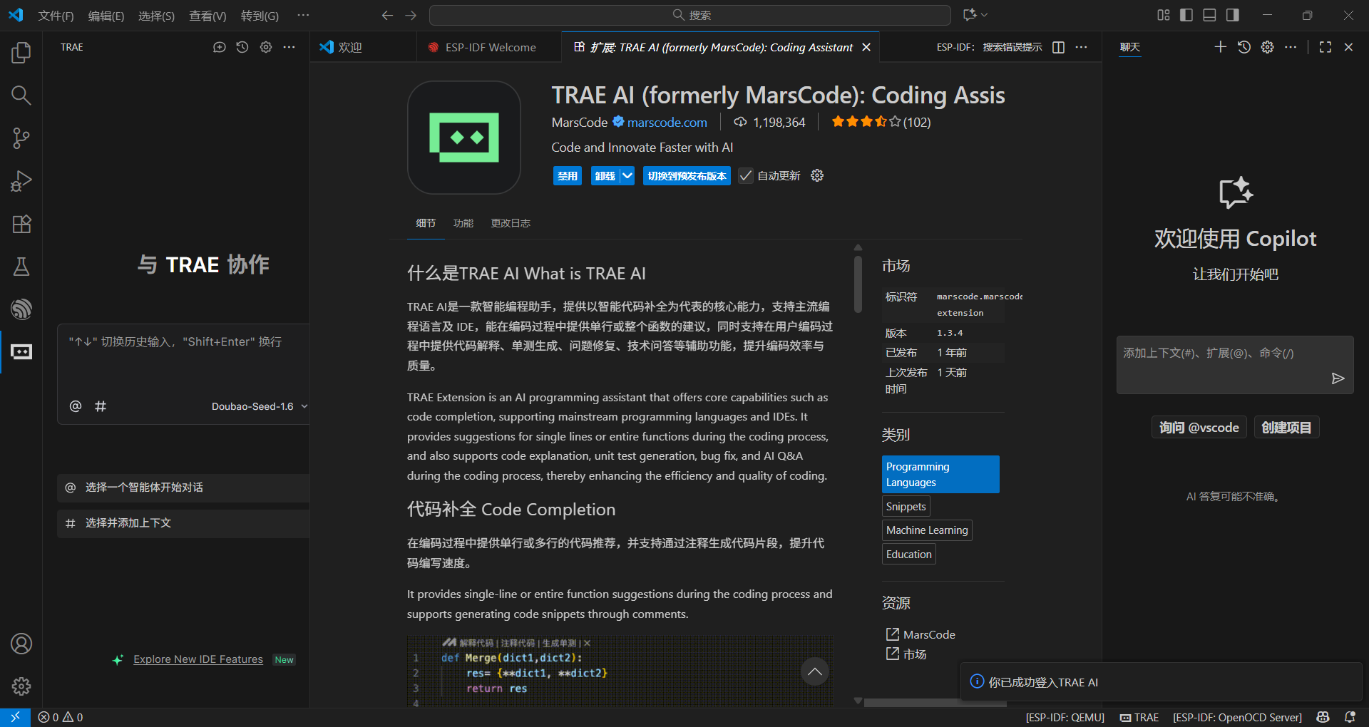 打开扩展界面,搜索“Trae”,点击下载: