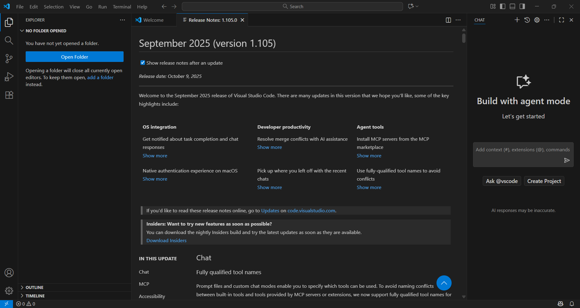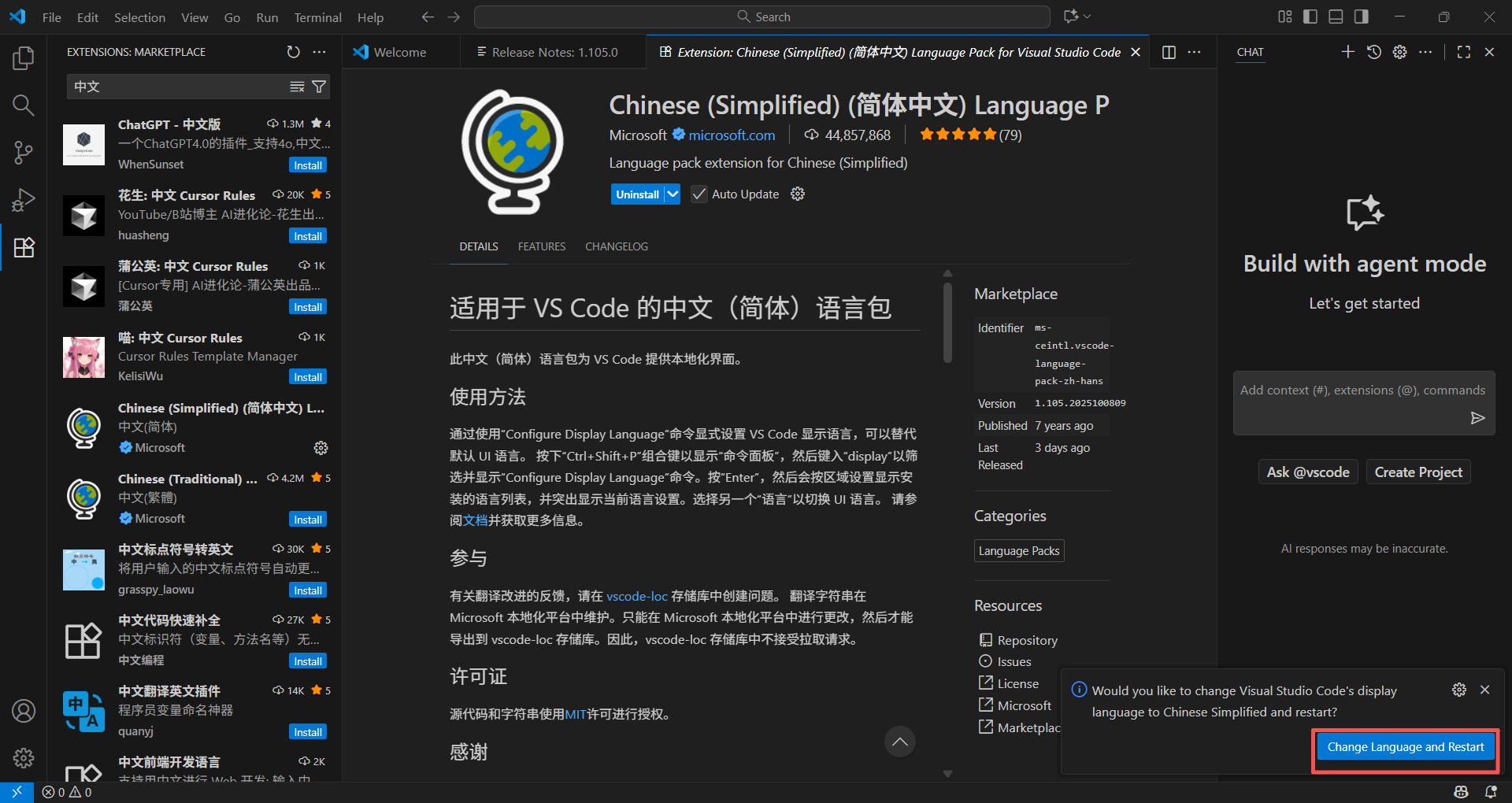 等待安装完成后,右下角会弹出一个弹窗,单击”Change Language and Restart“,之后VS Code会重启,再次启动后就是熟悉的中文界面了: