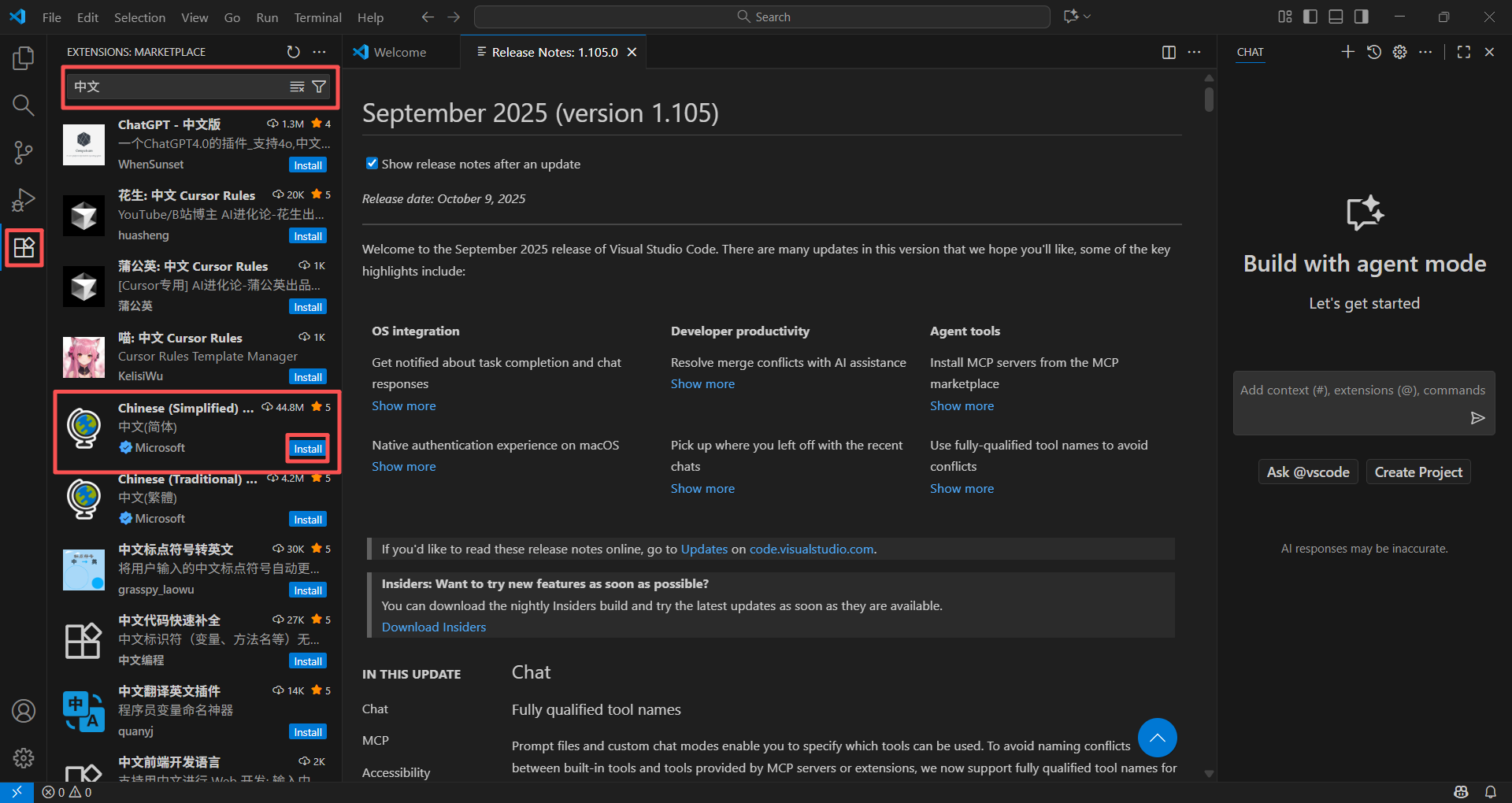 **全是英文我看不懂!**什么都不管,直接单击左侧栏四个小方块,在此区域搜索中文,找到”Chinese(Simplified)“单击右侧的”Install“: