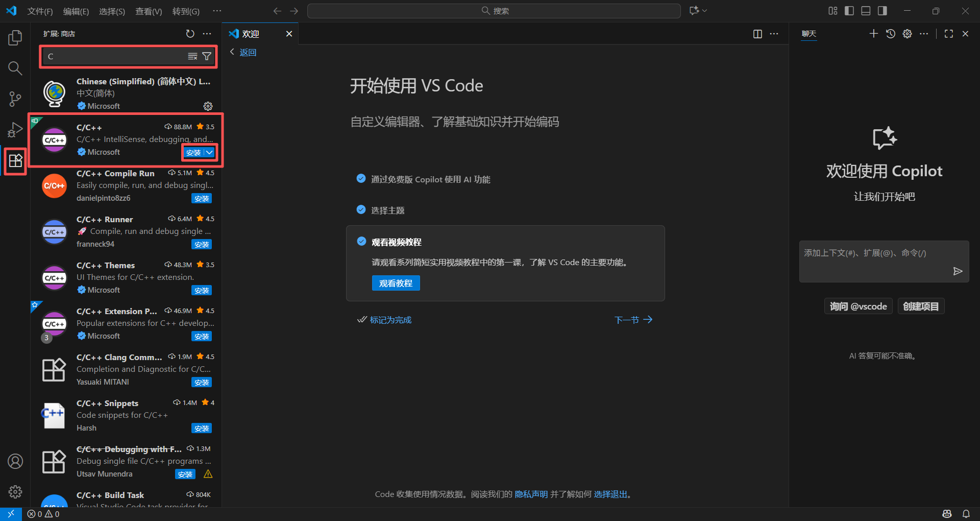 还是原位置四个小方块,搜索”C“,找到”C/C++“单击安装,等待安装完成: