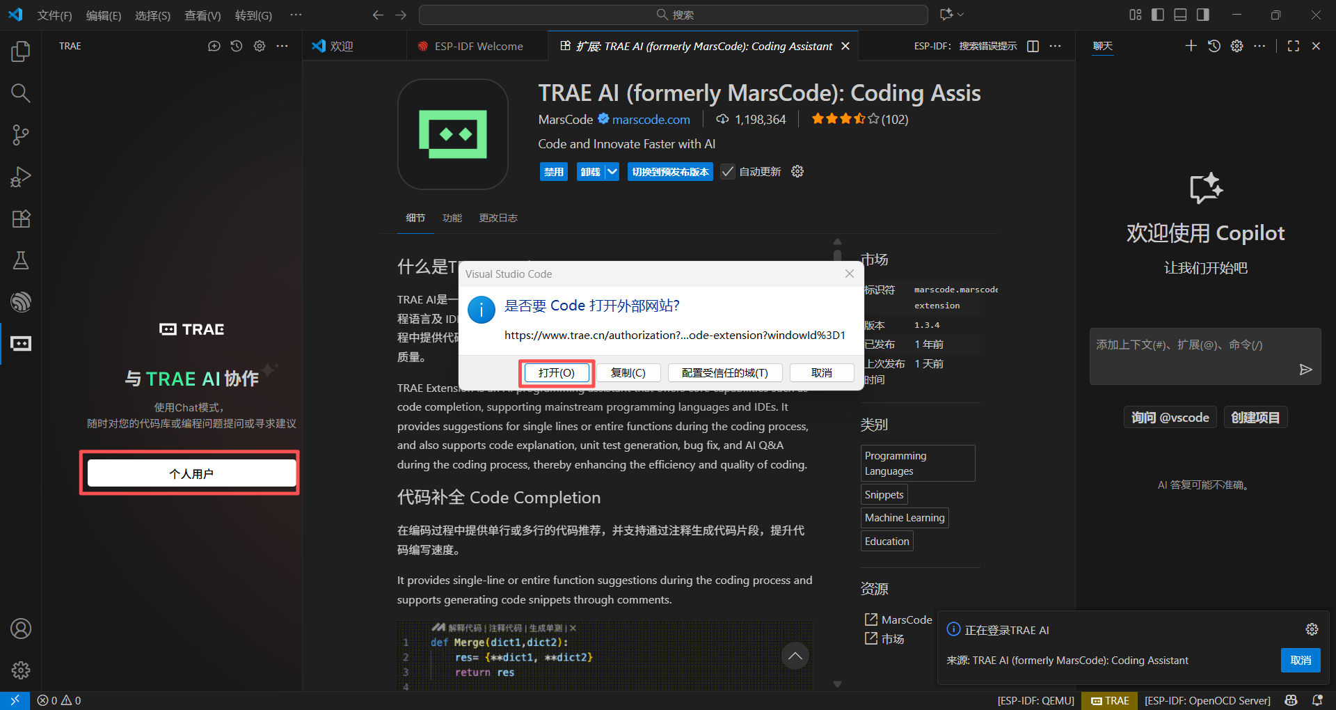 安装好后,左侧边栏会出现一个图标,点击进入Trae的窗口,点击”个人用户“,弹出的窗口中选择打开: