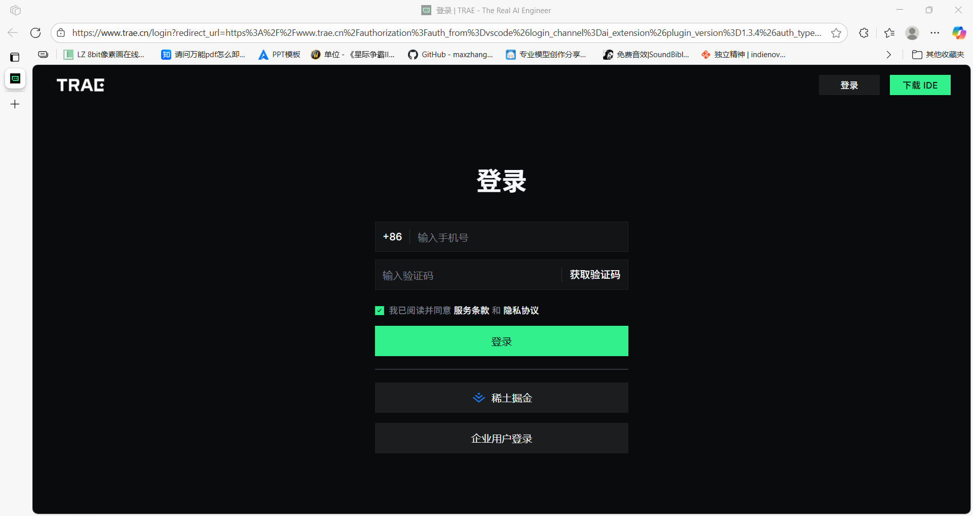 点击”登录“后,新界面点击”登录并打开TRAE“: