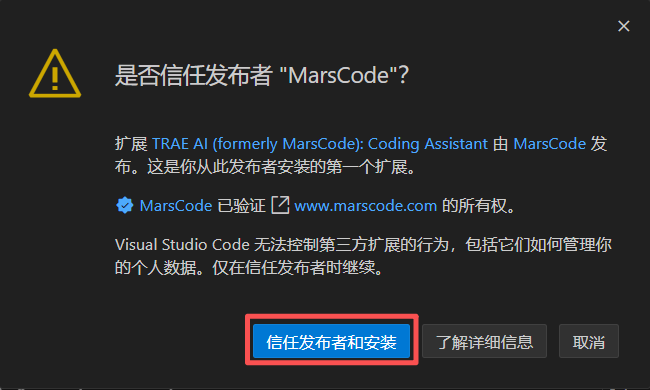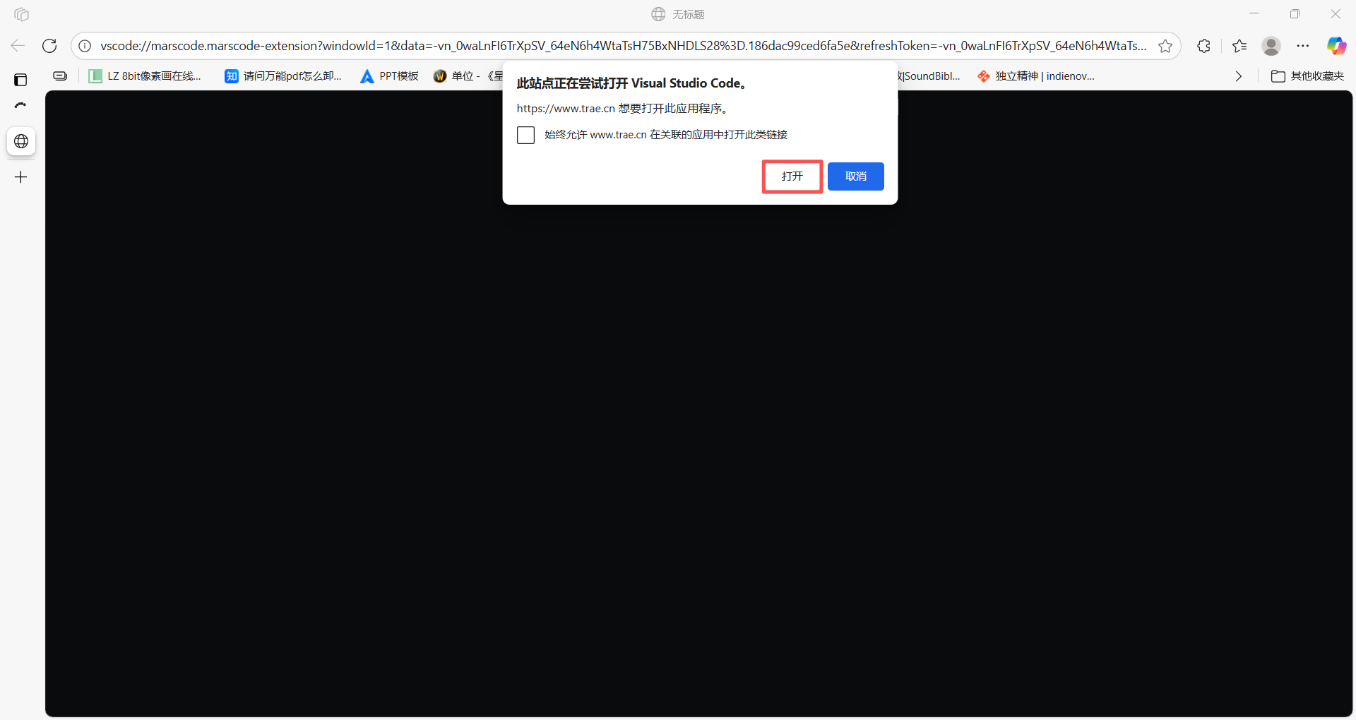 回到VS Code,新弹窗中选择”允许TRAE访问外部链接”(大致意思是这样,我手快了没截上图)。