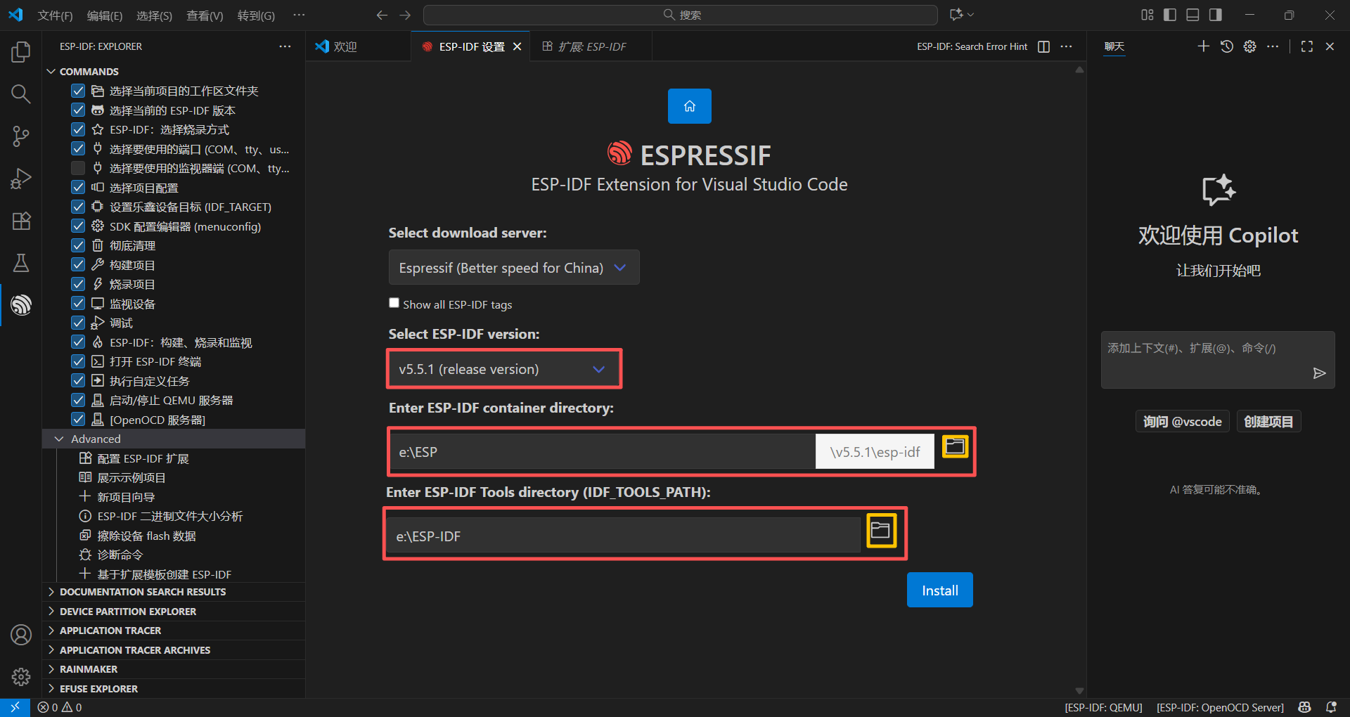 下载完成后,左边侧栏会出现一个ESP的图标,打开,点击”Advanced“下拉三角,选择”配置ESP-IDF扩展“,点击”EXPRESS":