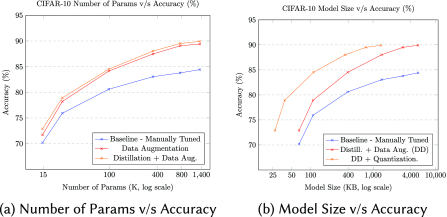 图1 展示了CIFAR-10数据集上参数数量与准确率的关系,其中“蒸馏+数据增强”方法在相同参数量下能达到更高的准确率,体现了优化模型在提升性能方面的潜力。 -