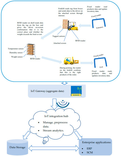 图3展示了物联网(IoT)驱动的库存管理和订单拣选系统,其中RFID读取器和各种传感器实时收集数据,并通过物联网网关和集成中心进行处理,以支持企业应用,这为AI实现高精度和实时性提供了数据基础。