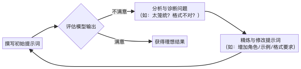 - 迭代优化:将模型输出视为初稿,通过不断修正提示词来逼近最优解。
