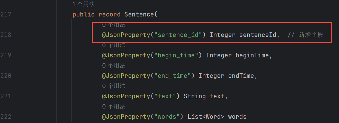 Caused by: com.fasterxml.jackson.databind.exc.UnrecognizedPropertyException: Unrecognized field "sentence_id" (class com.alibaba.cloud.ai.dashscope.api.DashScopeAudioTranscriptionApi$Outcome$Transcript$Sentence), not marked as ignorable (4 known properties: "end_time", "begin_time", "text", "words"])