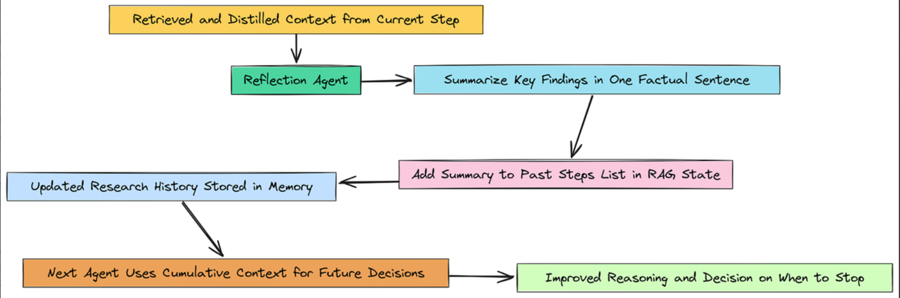 我们将构建一个反思代理,其唯一任务是执行此整合。它将从当前步骤中提取丰富、精炼的上下文,并将其总结为一个单一的事实性句子。然后,这个总结会被添加到我们过去步骤列表中,该列表位于检索增强生成状态中。