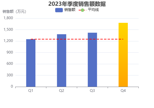 "2023年季度销售额数据: Q1:1250万元,同比增长12% Q2:1380万元,同比增长8% Q3:1420万元,同比增长15% Q4:1680万元,同比增长22% 要求:生成柱状图,Q4使用金色渐变,添加平均线1250万元"