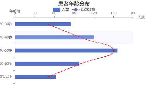 "患者年龄分布: 20-30岁:85人,30-40岁:120人 40-50岁:156人,50-60岁:98人 60岁以上:63人 要求:人口金字塔图,添加正态分布曲线"