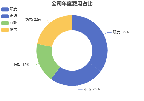 "公司年度费用占比: 研发:35%,市场:25%,行政:18%,销售:22% 要求:环形图,研发部分突出显示,添加百分比标签"