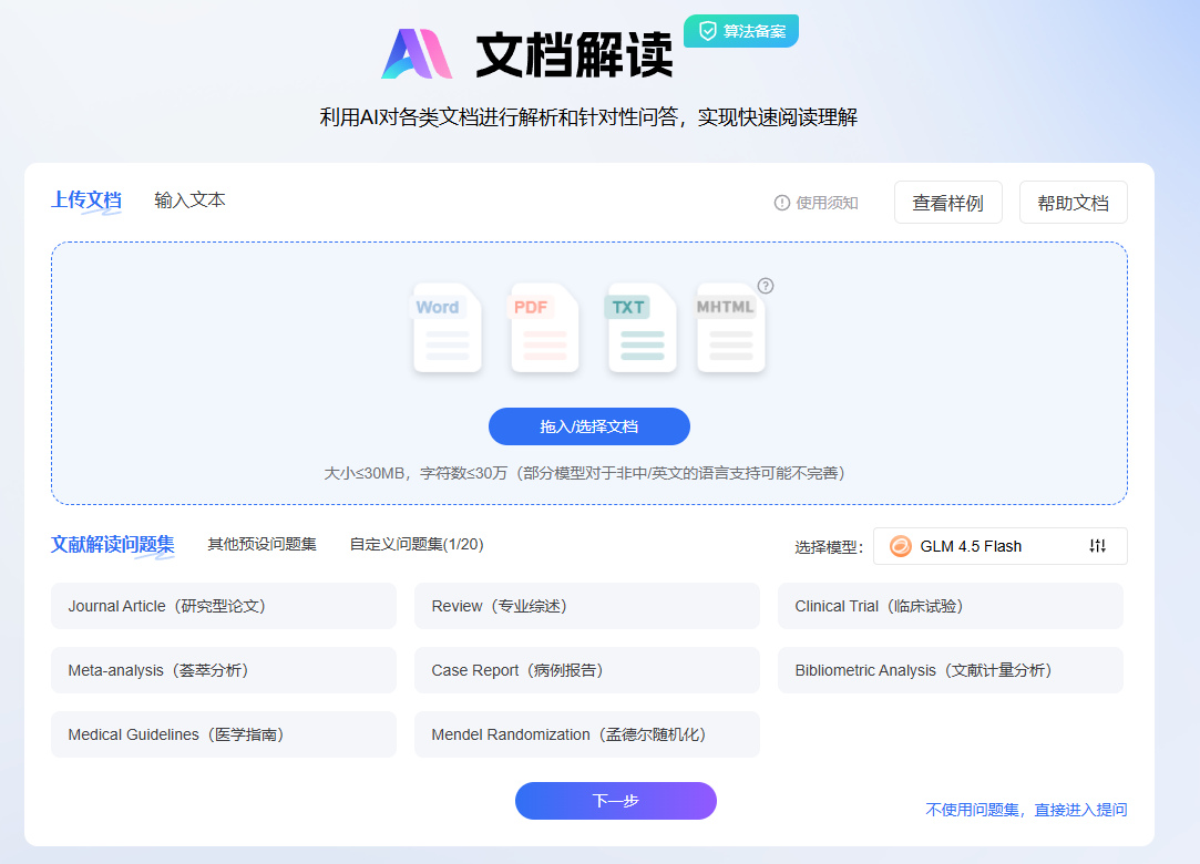 文档解读支持DOCX、PDF、TXT、MHTM等多种格式,单篇最大可达30MB、字符数上限30万字——意味着无论是长篇英文综述还是大篇幅专利文档,它都能轻松处理。