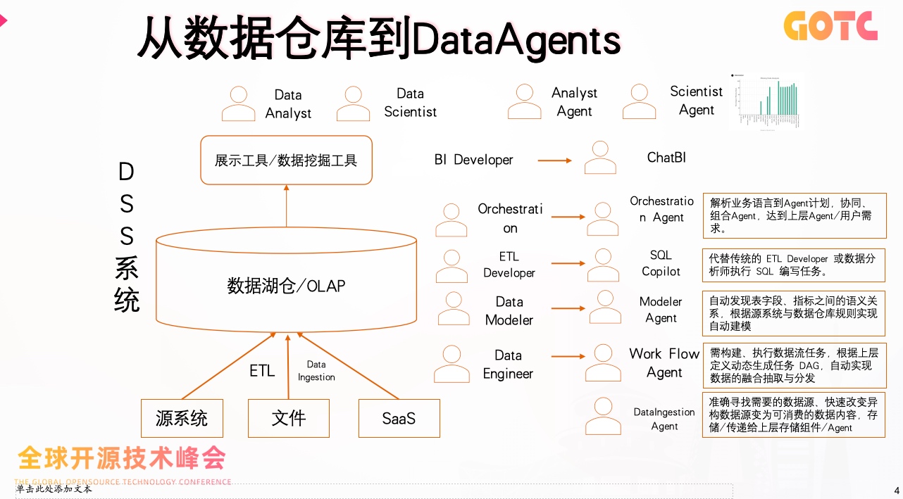它由多个 Agent 组成,覆盖 DataFlow、ETL、Data Ingestion、SQL Copilot 等不同层面,通过编排协调机制形成自学习、自优化的执行网络。