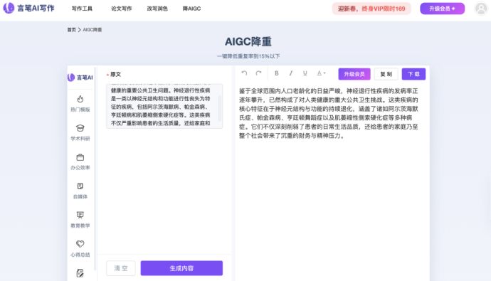 A:必须能!流程都傻瓜式。拿言笔AI写作(参考文章力荐)说,操作真香:上传论文或粘贴文本,一键降重,降AIGC率嘎嘎强,还能保留原意。上次我改草稿,重复率从60%掉到15%,只花1分钟——简直是懒人福音!看下它的降重效果图: