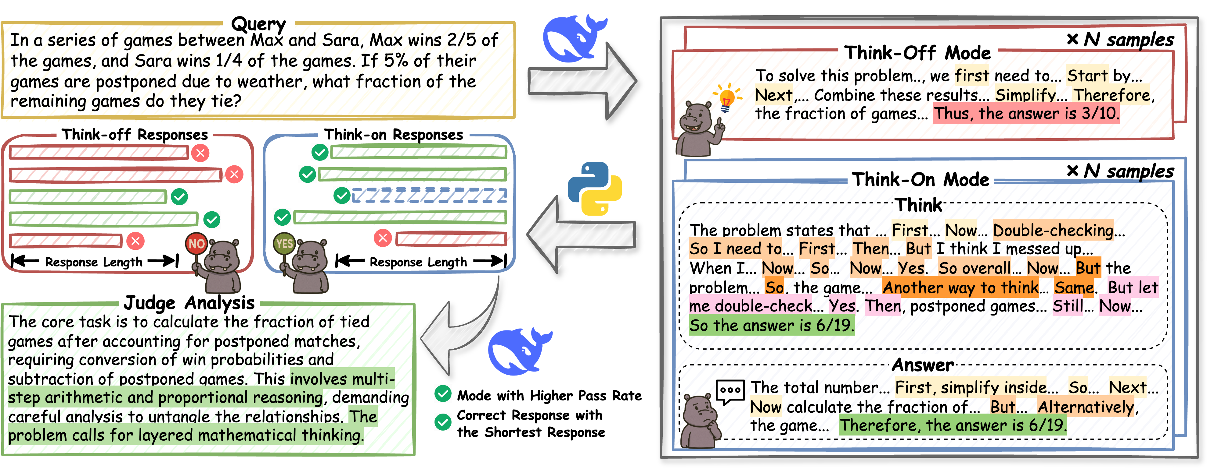 2.双模式响应生成与优选:对于每个问题,使用一个强大的推理模型(如DeepSeek-V3)分别生成N个“Think-on”(带推理)和N个“Think-off”(直接回答)的响应。然后,自动验证所有回答的正确性。