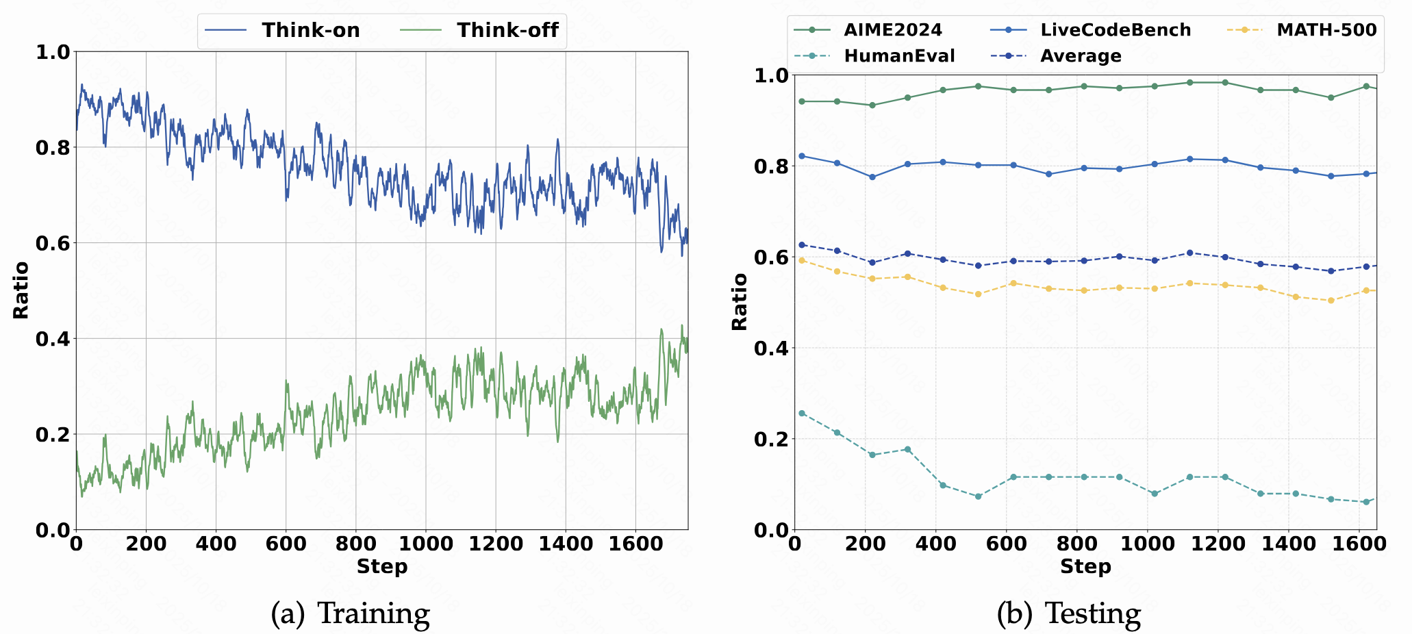 上图(b)显示,在不同数据集上,模型的思考模式激活率与任务特性高度相关。在AIME2024、LiveCodeBench等需要强推理的任务上,“Think-on”率始终保持在70%以上;而在HumanEval等相对简单的代码任务上,“Think-on”率则随训练明显下降,体现了良好的任务适应性。