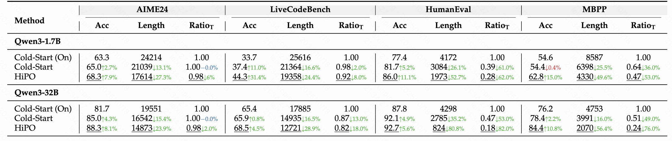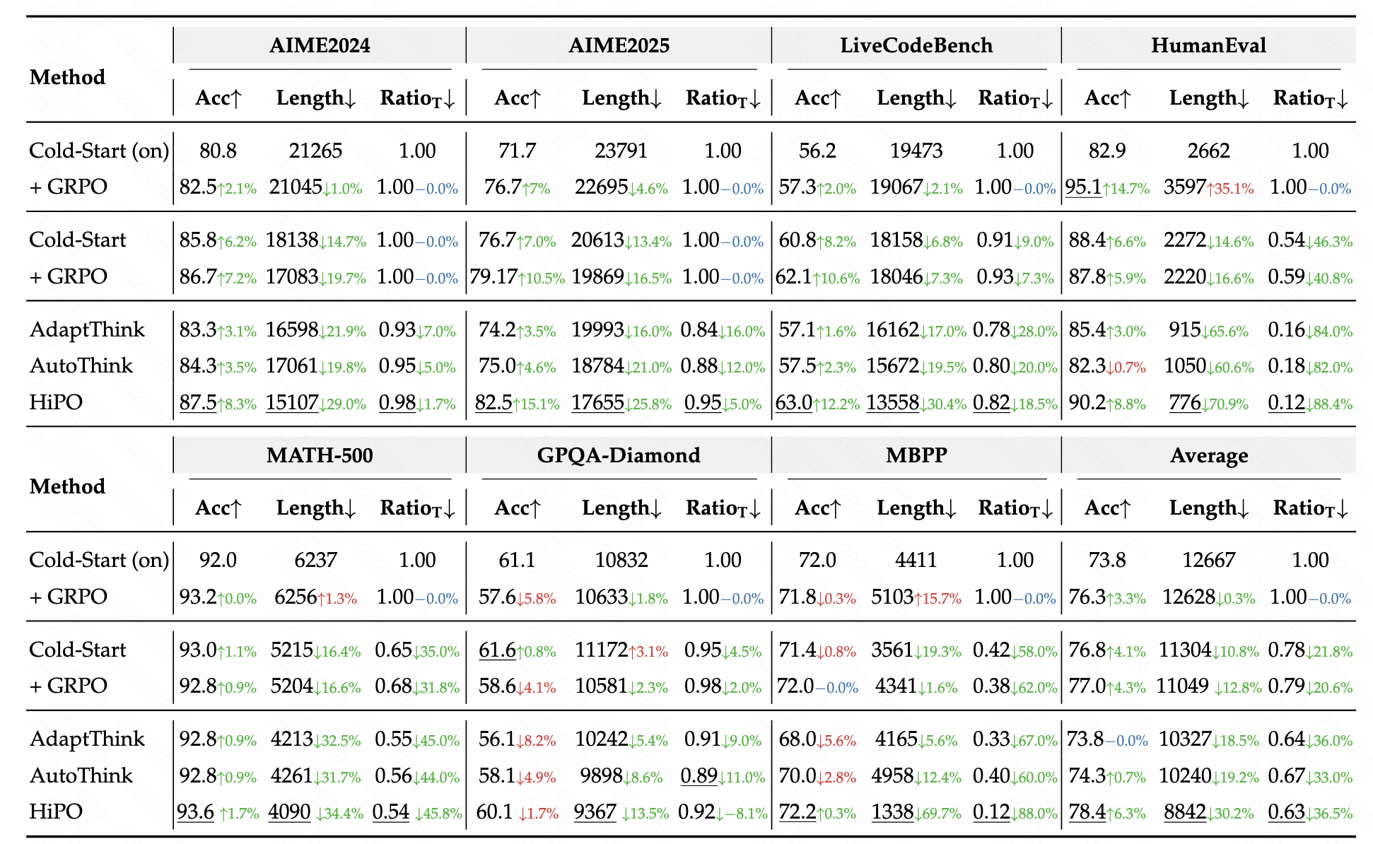 HiPO在基于Qwen3系列模型(如8B参数版本)的实验中,取得了令人瞩目的成果。在AIME2024/2025、HumanEval、LiveCodeBench(v6)、MATH-500、GPQA-Diamond等多个权威基准测试上,与多种基线方法进行了全面对比,并进行了充分的消融实验。