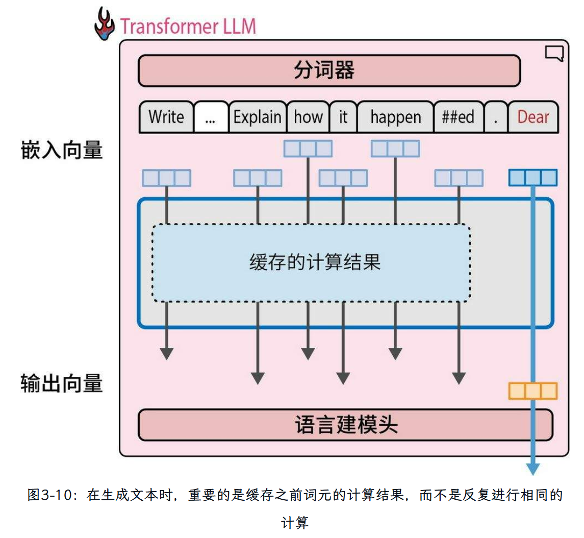 在生成第二个词元时,我们只是简单地将输出词元追加到输入的末尾,然后再次通过模型进行前向传播。如果模型能够缓存之前的计算结果(特别是注意力机制中的一些特定向量),就不需要重复计算之前的流,而只需要计算最后一条流了。这种优化技术被称为键-值(key-value,KV)缓存,它能显著加快生成过程。键和值是注意力机制的核心组件,我们将在本章后面详细介绍。如图3-10所示,在生成第二个词元时,由于我们缓存了之前流的结果,只有一条计算流是活跃的。