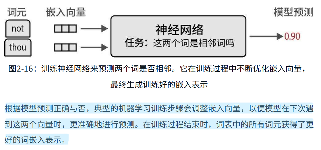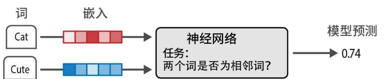 嵌入向量是通过分类任务生成的。这种任务用于训练神经网络,以预测词是否经常出现在相同的上下文中(这里的上下文指的是我们建模的训练数据集中的多个句子)。我们可以将其理解为一个神经网络,它接收两个词作为输入,如果这两个词倾向于出现在相同的上下文中则输出1,否则输出0。