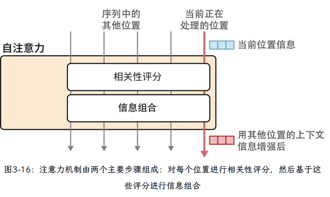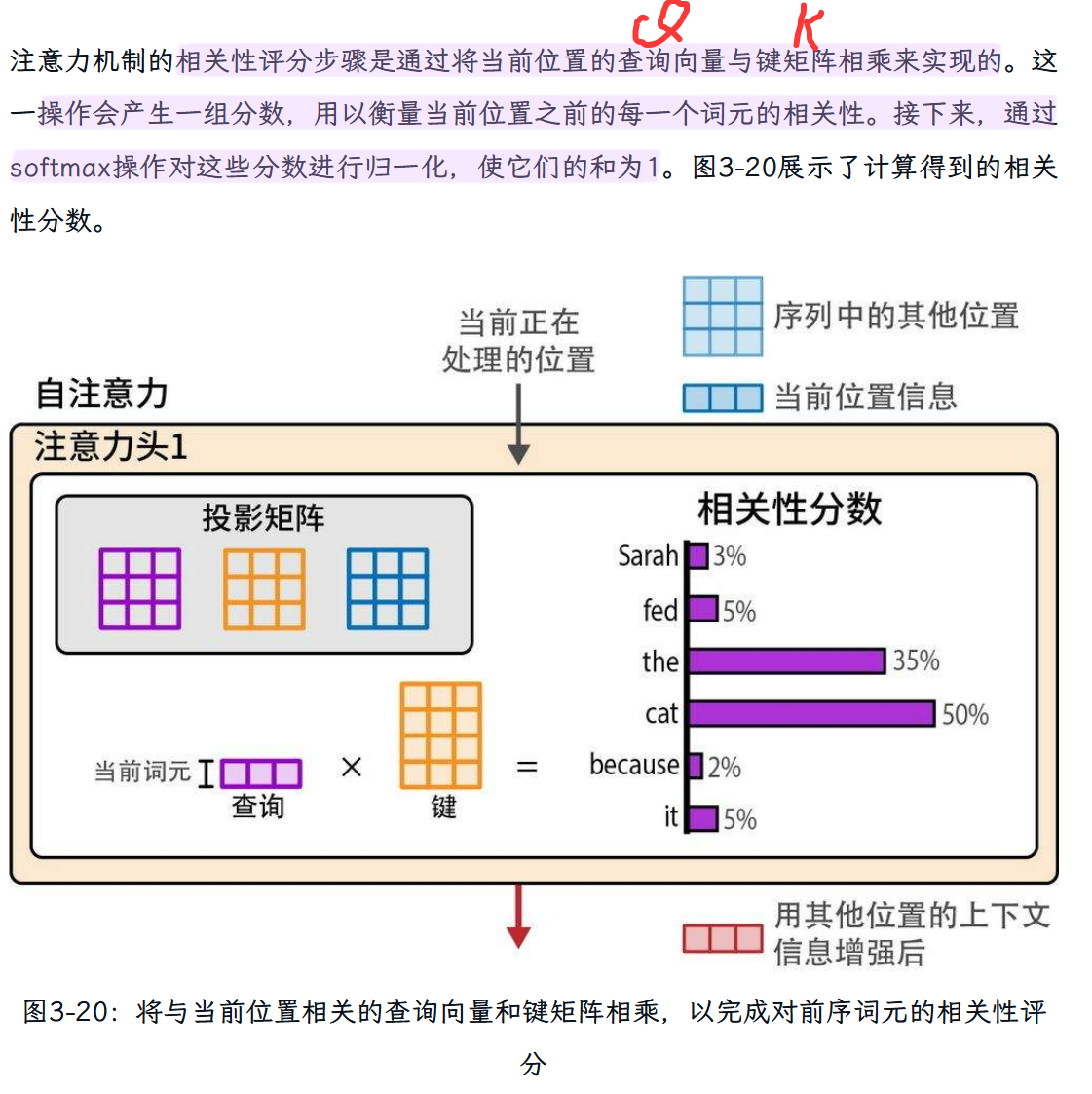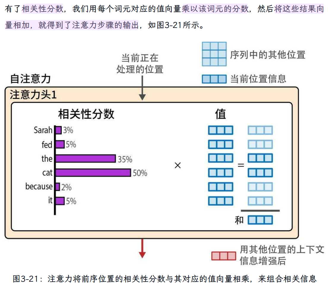 目标是为当前位置生成一个新的表示,其中包含来自前序词元的相关信息。例如,我们正在处理句子“Sarah fed the cat because it”(Sarah喂了猫,因为它)的最后一个位置,我们希望it表示那只猫,所以注意力机制会融入来自cat词元的“猫的信息”。