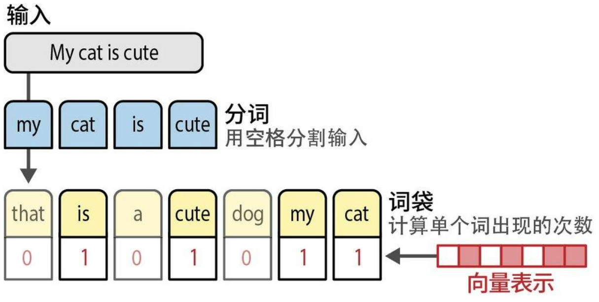 词袋模型的第一步是分词(tokenization),即将句子拆分成单个词或子词(词元,token),词袋模型旨在以数字形式创建文本的表示(representation),也称为向量或向量表示。在本书中,我们将这类模型称为表示模型(representation model)。缺点:忽略了文本的语义特性和含义。
