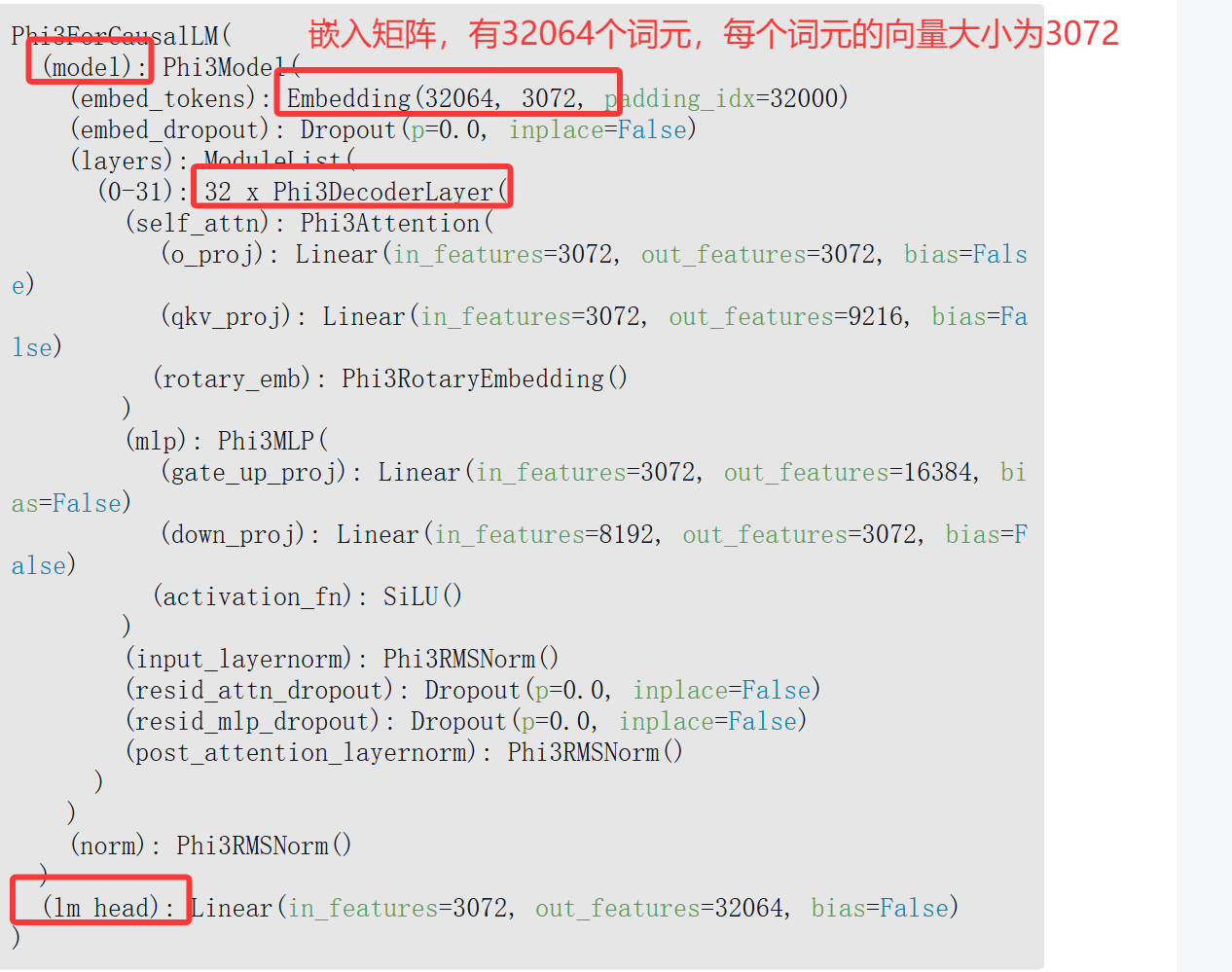 语言建模头本身是一个简单的神经网络层。它可以连接到堆叠的Transformer块上的多种可能的“头”之一,用于构建不同类型的系统。其他类型的Transformer头包括序列分类头和词元分类头。我们只需打印模型变量,就可以按顺序显示所有层。对于这个模型,我们得到:
