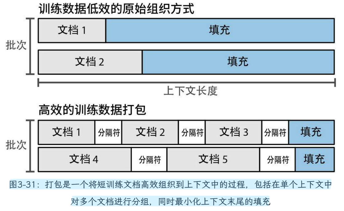 当我们将模型扩展到更大的规模时,这些方法会带来一些挑战,这要求我们找到提高其效率的途径。例如,在训练长上下文模型时的一个挑战是,训练集中有很多文档的长度都远小于上下文长度。如果为一个只有10个词的短句分配整个4K的上下文空间,这显然是很低效的。因此在模型训练过程中,多个文档会被一同打包到每个训练批次的上下文中。(注:llamafactory在pt阶段,默认是将打包序列的设置为True)。