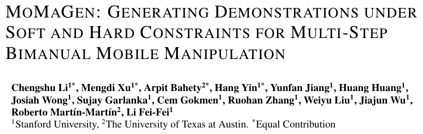 - 论文标题: MOMAGEN: GENERATING DEMONSTRATIONS UNDER SOFT AND HARD CONSTRAINTS FOR MULTI-STEP BIMANUAL MOBILE MANIPULATION