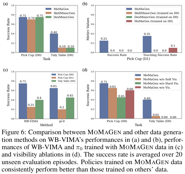 - 相比之下,MOMAGEN 在所有难度等级和所有任务上都保持了可观的成功率,证明了其处理移动操纵任务的强大能力。