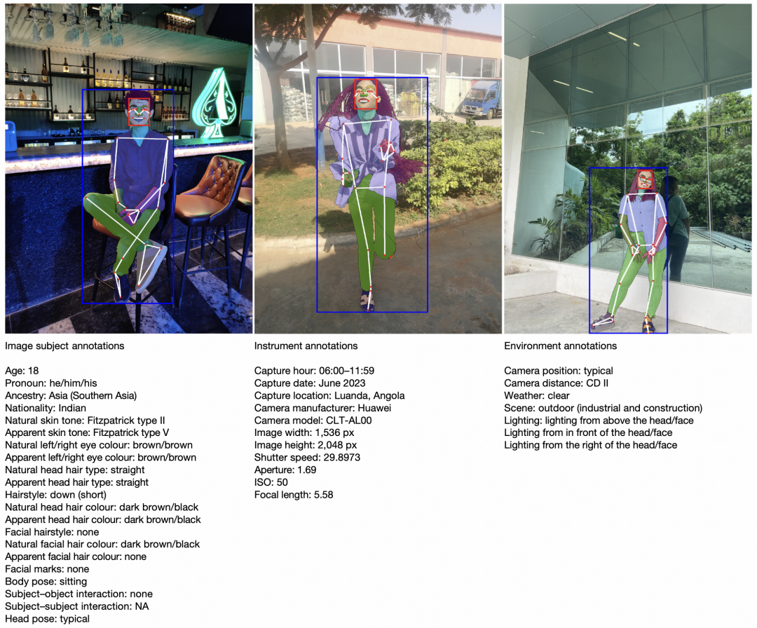 FHIBE 的每张图像均附有自述姿势、互动、外观特征、年龄类别标注以及人脸、人物编辑框的像素级标注,包括 33 个关键点与 28 类分割标签。每条标注均附有匿名化编号以及标注者主动披露的人口统计信息,以保证可追溯性与透明度。据论文介绍,这种像素级标注与属性标签相结合的方式,使得FHIBE成为“当前最全面标注的公平性数据集”。